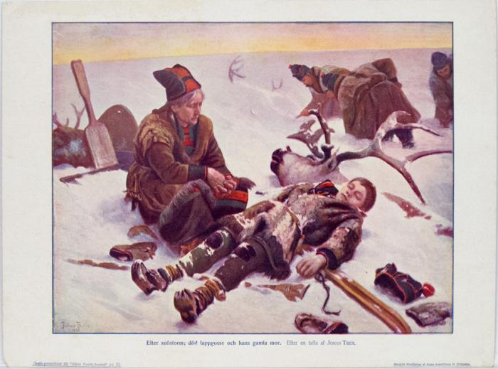 - Reproduktion. Johan Tirén, Efter snöstorm: död lappgosse och hans gamla mor. Konstbilaga Allers Familjejournal