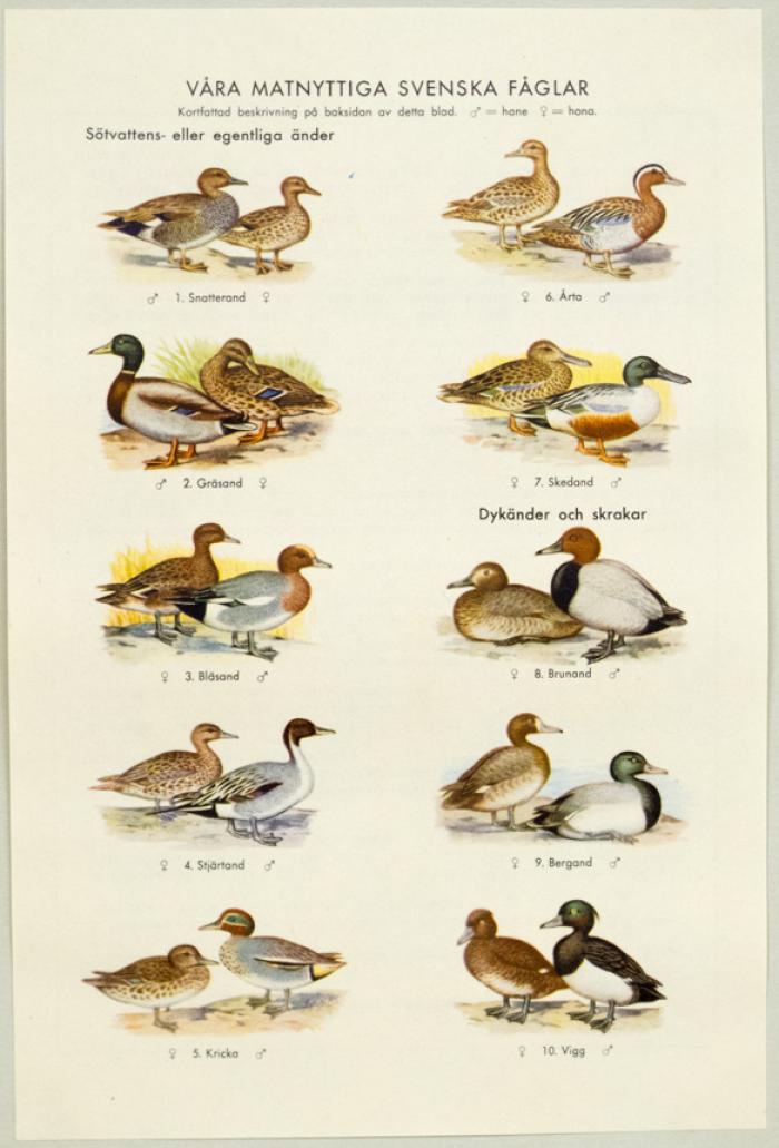 Plansch. Våra matnyttiga svenska fåglar. Sötvattens- eller egentliga änder