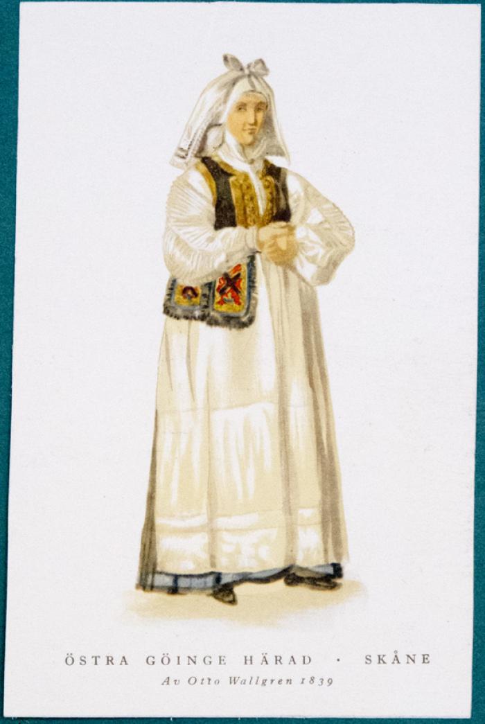 Plansch. Folkdräkt. Östra Göinge Härad, Skåne. Av Otto Wallgren 1839