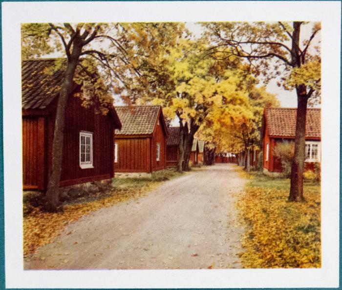 Vykort. Röda hus vid väg