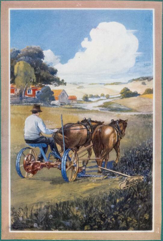 Illustration. Bonde som kör med hästar.