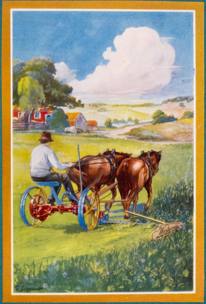 Illustration. Bonde kör med hästar
