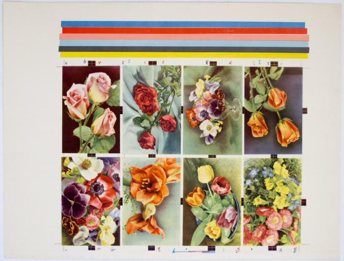 Vykort. Oskurna på ark. Blommor