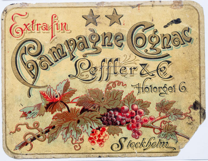 Etikett. Champagne Cognac Leffler & Co, Stockholm