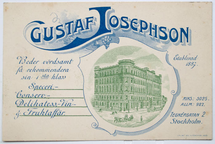 Reklamtryck. Gustaf Josephson, Speceri- konserv. delikatessaffär. Stockholm