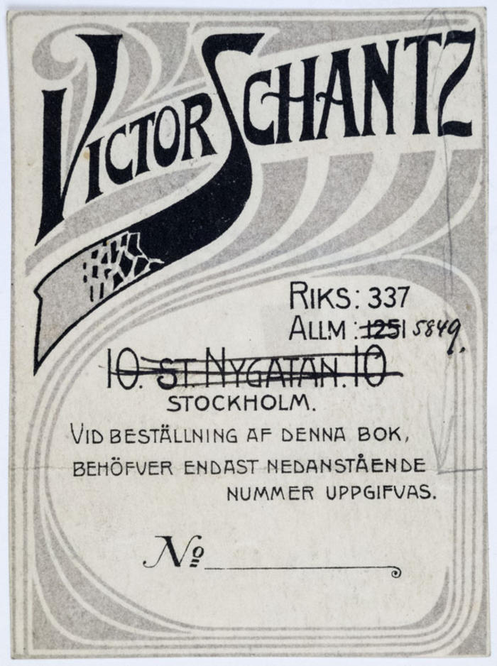 Reklamtryck. Victor Schantz, bokhandel, Stockholm