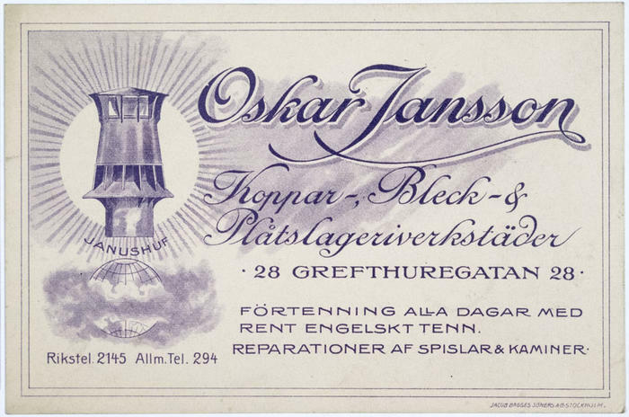 Reklamtryck. Oskar Jansson. Koppar- Bleck & Plåtslageriverkstäder, Stockholm