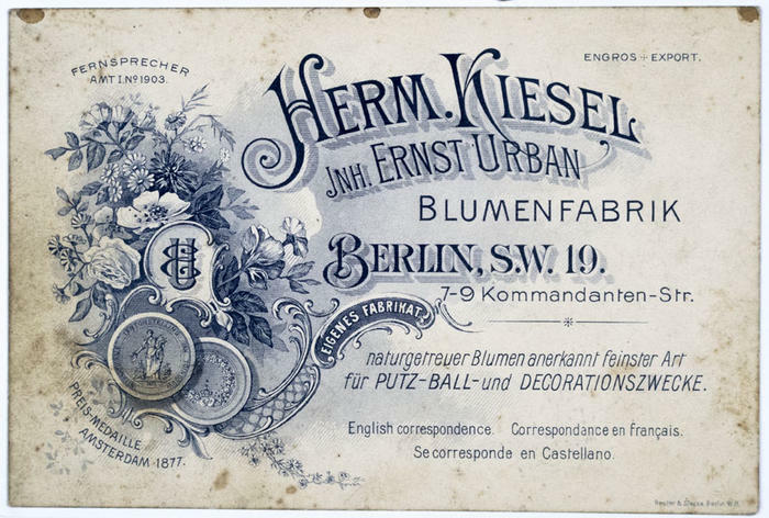 Reklamtryck. Herm. Kiesel Blumenfabrik, Berlin