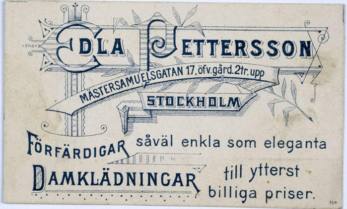 Reklamtryck. Edla Pettersson Damklädningar, Mäster Samuelsgatan 17, Stockholm