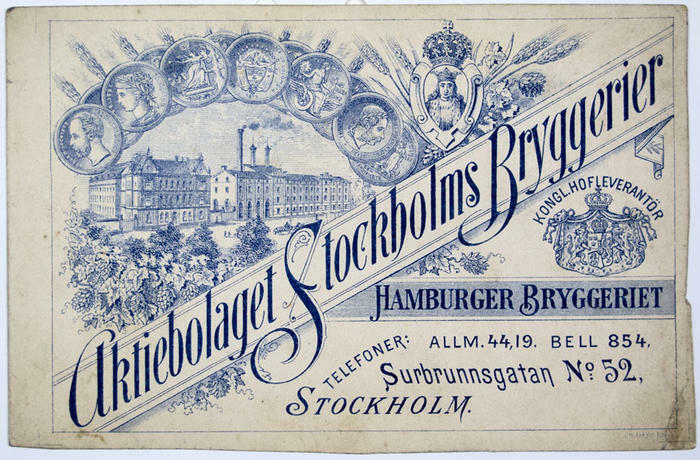 Reklamtryck. Stockholms Bryggerier, Aktiebolaget. Hamburgerbryggeriet, Surbrunnsgatan 52 Stockholm