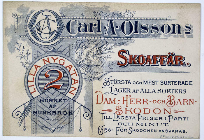 Reklamtryck. Carl A. Olssons Skoaffär, Lilla Nygatan 2 Stockholm