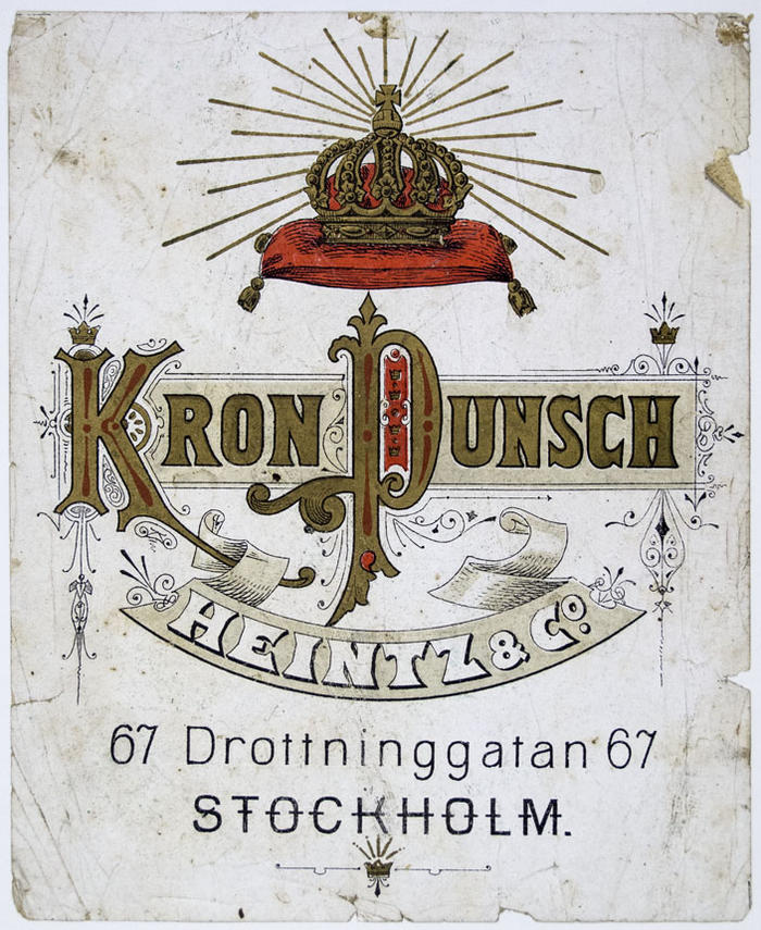 Etikett. Kron Punsch. Heintz & Co, Drottningatan 67 Stockholm