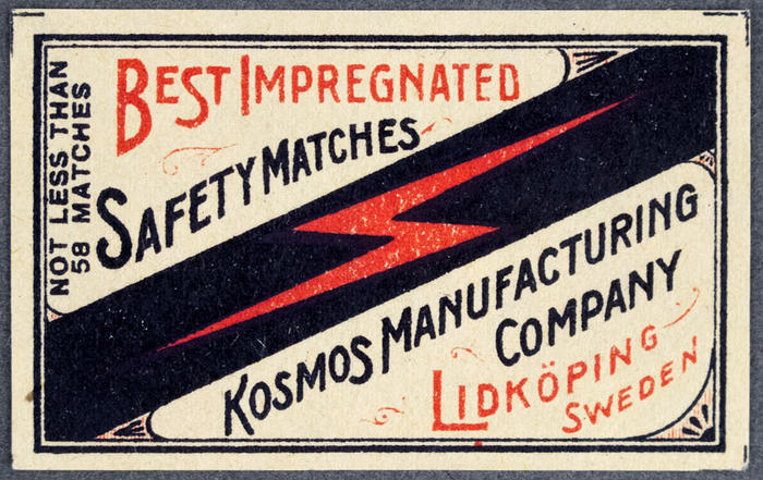 Tändsticksetikett. Kosmos Manufacturing Company Lidköping. Best impregnated safety matches