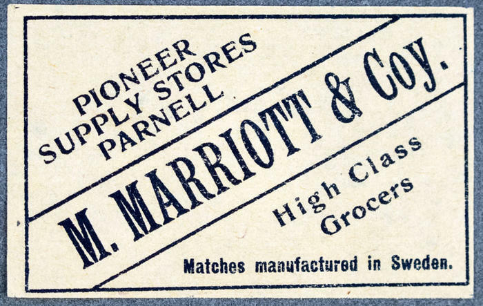 Tändsticksetikett. M.Marriott & Coy. Pioneer supply stores Parnell