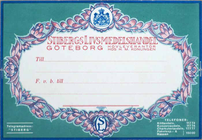 Etikett. Stibergs Livsmedelshandel, Göteborg
