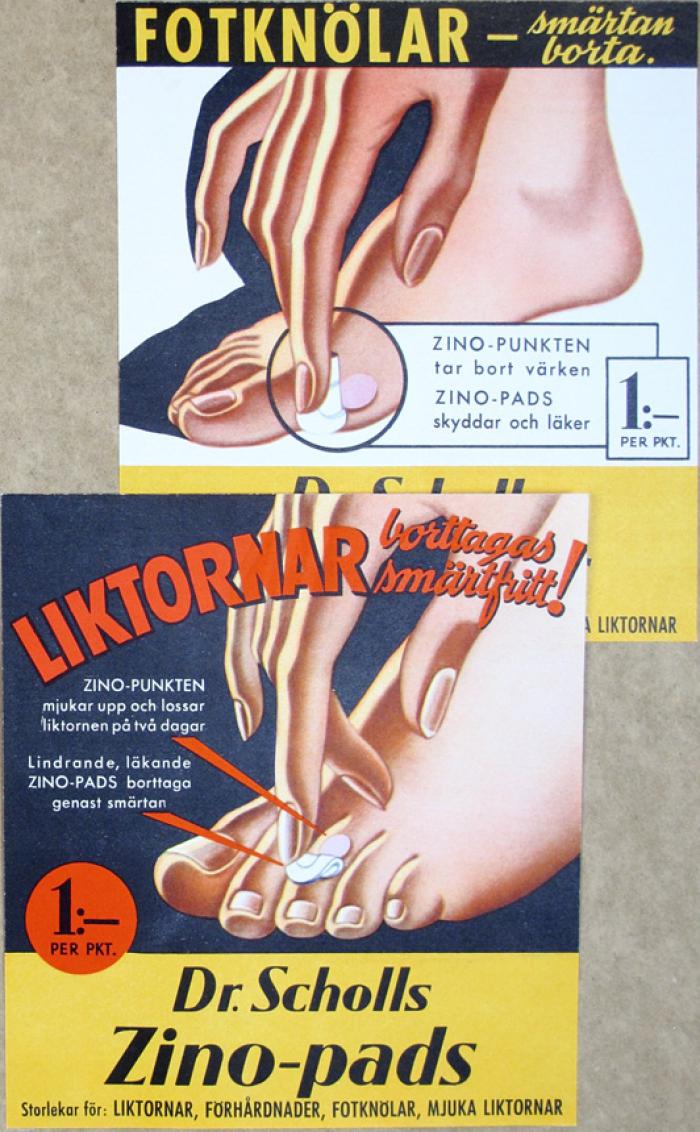 Reklamtryck. Fotknölar – smärtan borta. Liktornar borttagas smärtfritt! Dr Scholls Zino-pads.