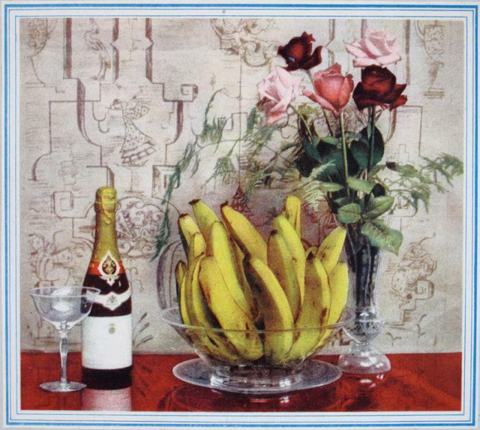 Illustration, champagne, bananer, blommor