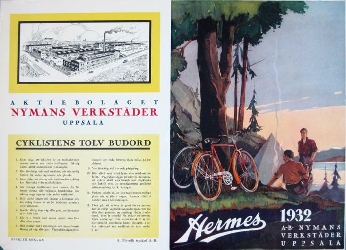 Reklamtryck. Hermes 1932. Aktiebolaget Nymans Verkstäder, Uppsala. Cyklistens tolv budord.