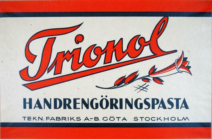 Reklamtryck. Trionos Handrengöringspasta. Tekniska Fabriken Göta, Stockholm