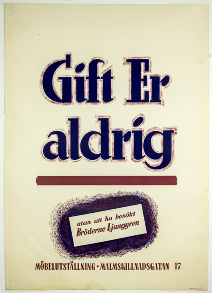 Reklamtryck. Gift er aldrig utan att besöka Bröderna Ljunggren Möbelutställning. 1946