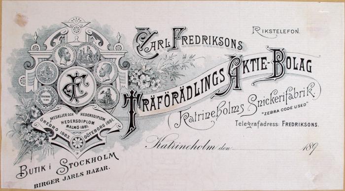 Fakturahuvud. Carl Fredriksons Träförädlings Aktie-Bolag Katrineholms Snickerifaabrik
