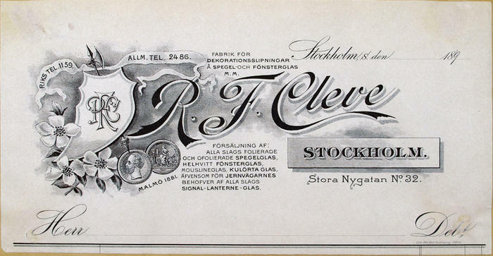 Fakturahuvud. R.F.Cleve, Stockholm. Spegel- och fönsterglas. Stockholm