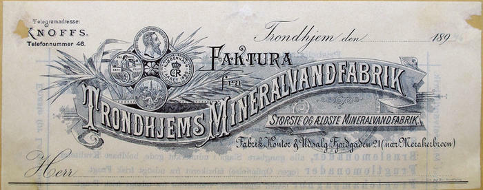 Fakturahuvud. Trondhjems Mineralvandfabrik