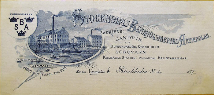Fakturahuvud. Stockholms Benmjölsfabriks Aktiebolag