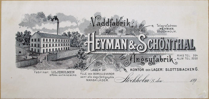 Fakturahuvud. Heyman & Schöntal, Vaddfabrik, Stockholm