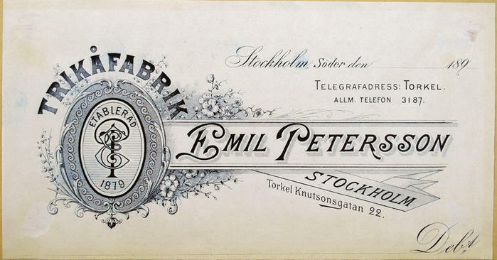 Fakturahuvud. Trikåfabrik Emil Pettersson Stockholm