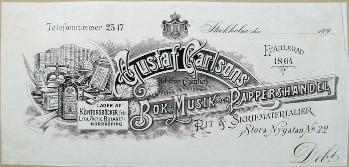 Fakturahuvud. Gustaf Carlssons Bok- Musik och Pappershandel, Stockholm