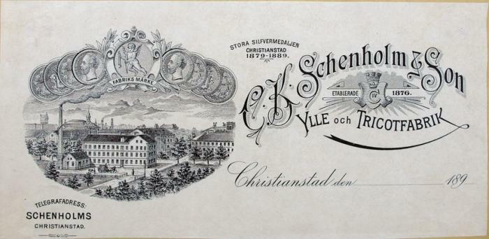 Fakturahuvud. C.K. Schenholm & Son Ylle & Tricotfabrik, Kristianstad