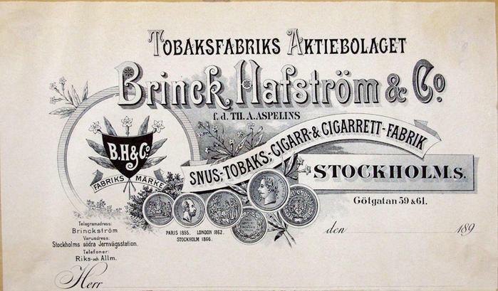 Fakturahuvud. Brinck Hafström & Co snus-, tobaks-, cigarr & cigarett-fabrik, Stockholm