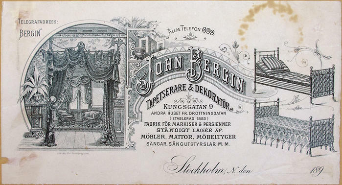 Fakturahuvud. John Bergin Tapetserare & Dekoratör, Stockholm