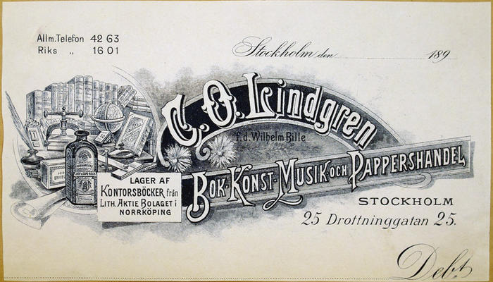 Fakturahuvud. Co. O. Lindgren Bok- Konst Musik och Pappershandel, Stockholm