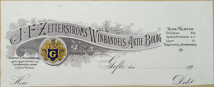 Fakturahuvud. J.F. Zetterströms Winhandels Aktiebolag, Gefle