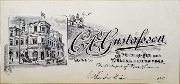 Brevhuvud. C. A. Gustafsson Speceri-, Vin och Delikatessaffär, Sundsvall