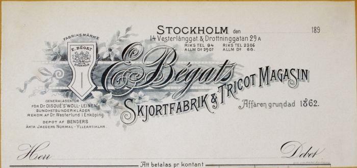 Brevhuvud. E. Bégats Skjortfabrik & Tricot Magasin, Stockholm