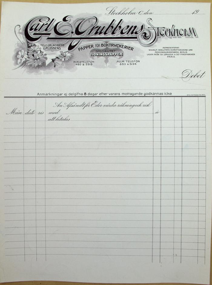 Fakturahuvud. Carl E. Grubbens, Pappershandel, Stockholm