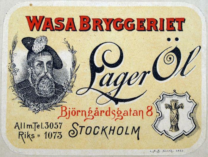 Etikett. Wasa Bryggeriet. Lager Öl. Stockholm