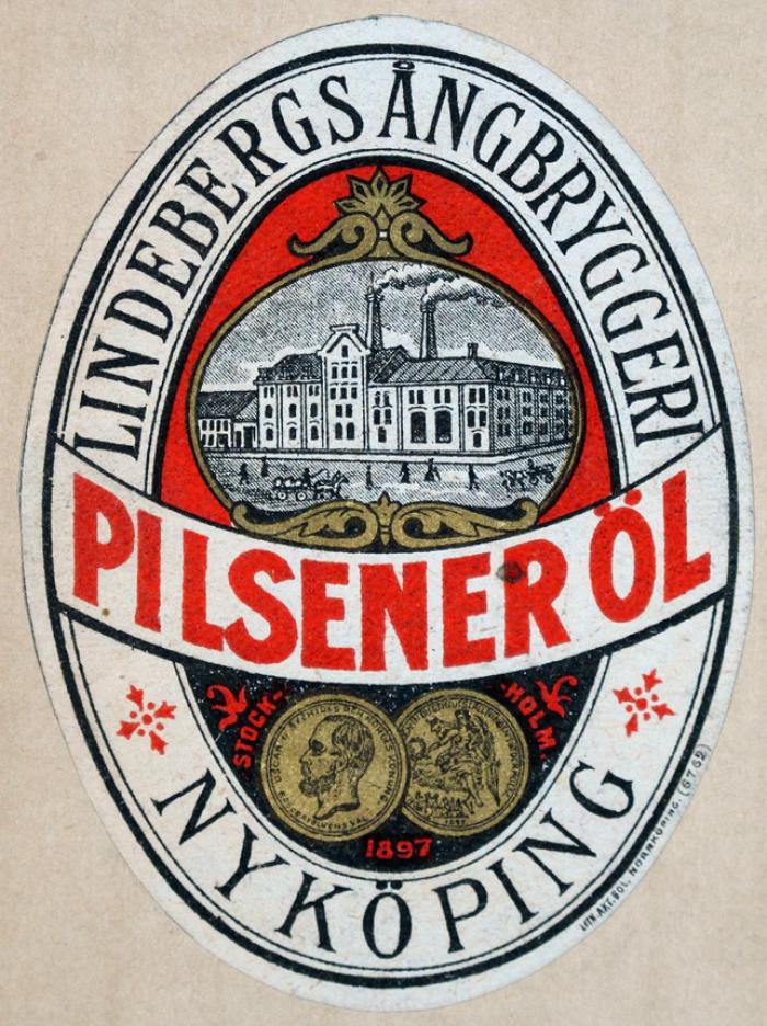 Etikett. Pilsener Öl, Lindebergs Ångbryggeri Nyköping