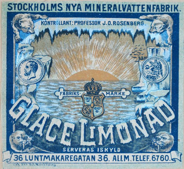 Etikett. Glace Limonad. Stockholms Nya Mineralvattenfabrik, Stockholm