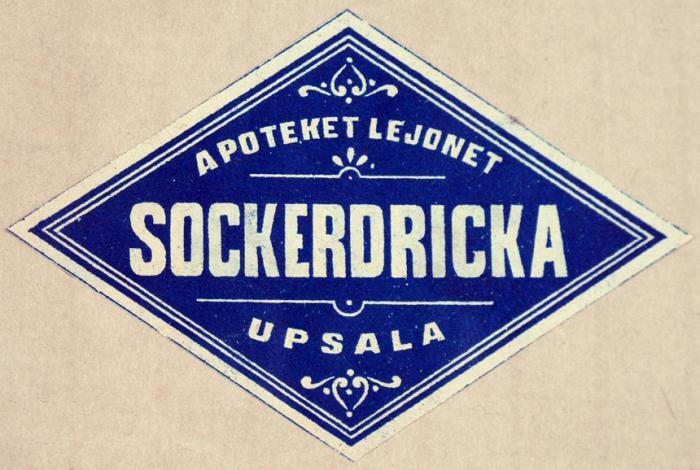 Etikett. Sockerdricka. Apoteket Lejonet Uppsala