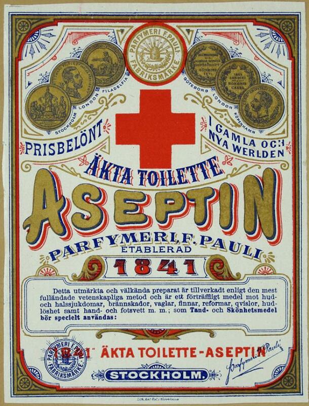 Etikett. Aseptin, Parfymeri F. Pauli. Stockholm