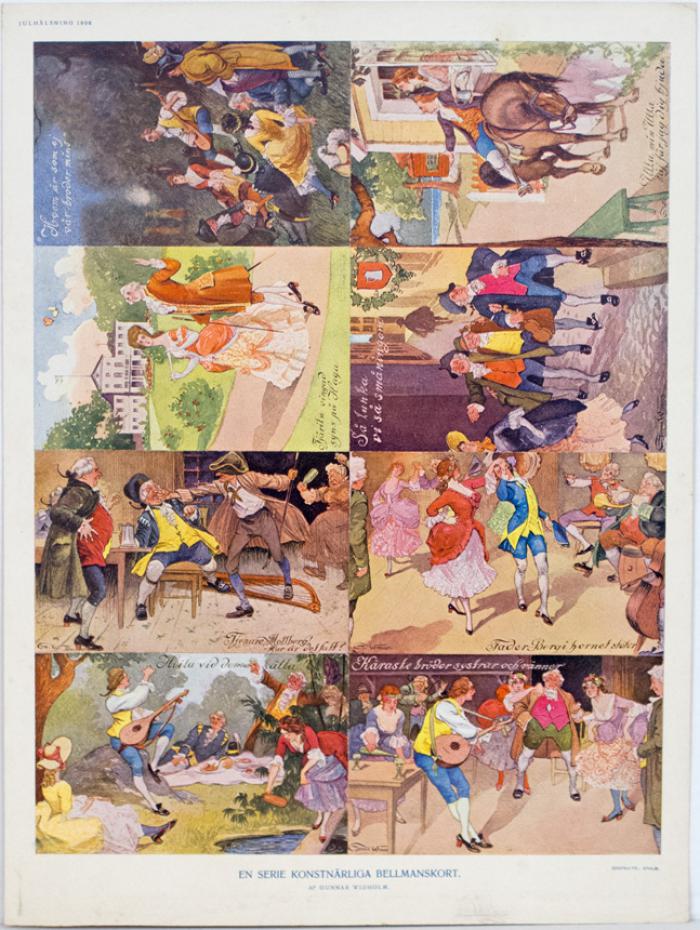 Vykort. Åtta obeskurna kort på ark med Bellmansmotiv. Julhälsning 1906. (Gunnar Widholm)