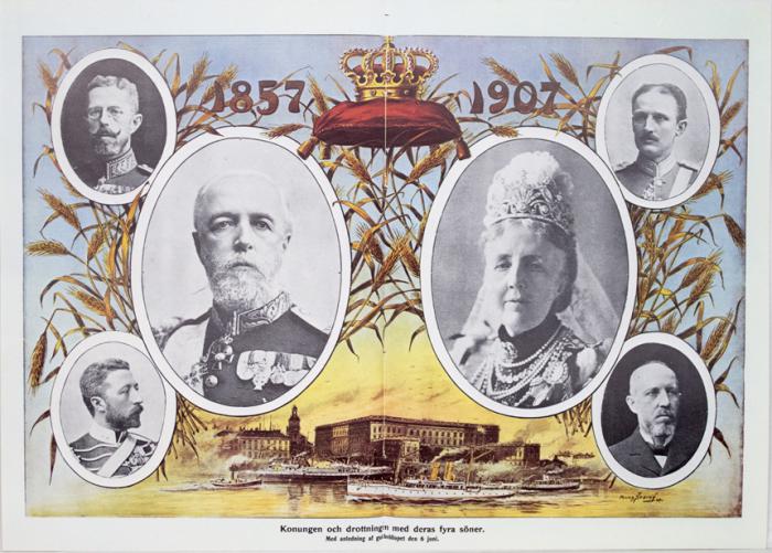 Plansch. 1857 - 1907 Konungen och drottningen med deras fyrasöner. Med anledning af guldbröllopet den 6 juni