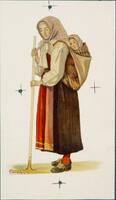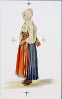 Plansch. Folkdräkt. Östra Göinge Härad, Skåne. Av Otto Wallgren 1839 -