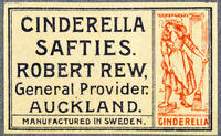 Tändsticksetikett. Cinderella safties. Robert Rew. Auckland -