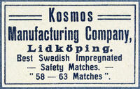 Tändsticksetikett. Kosmos Manufacturing Company Lidköping -